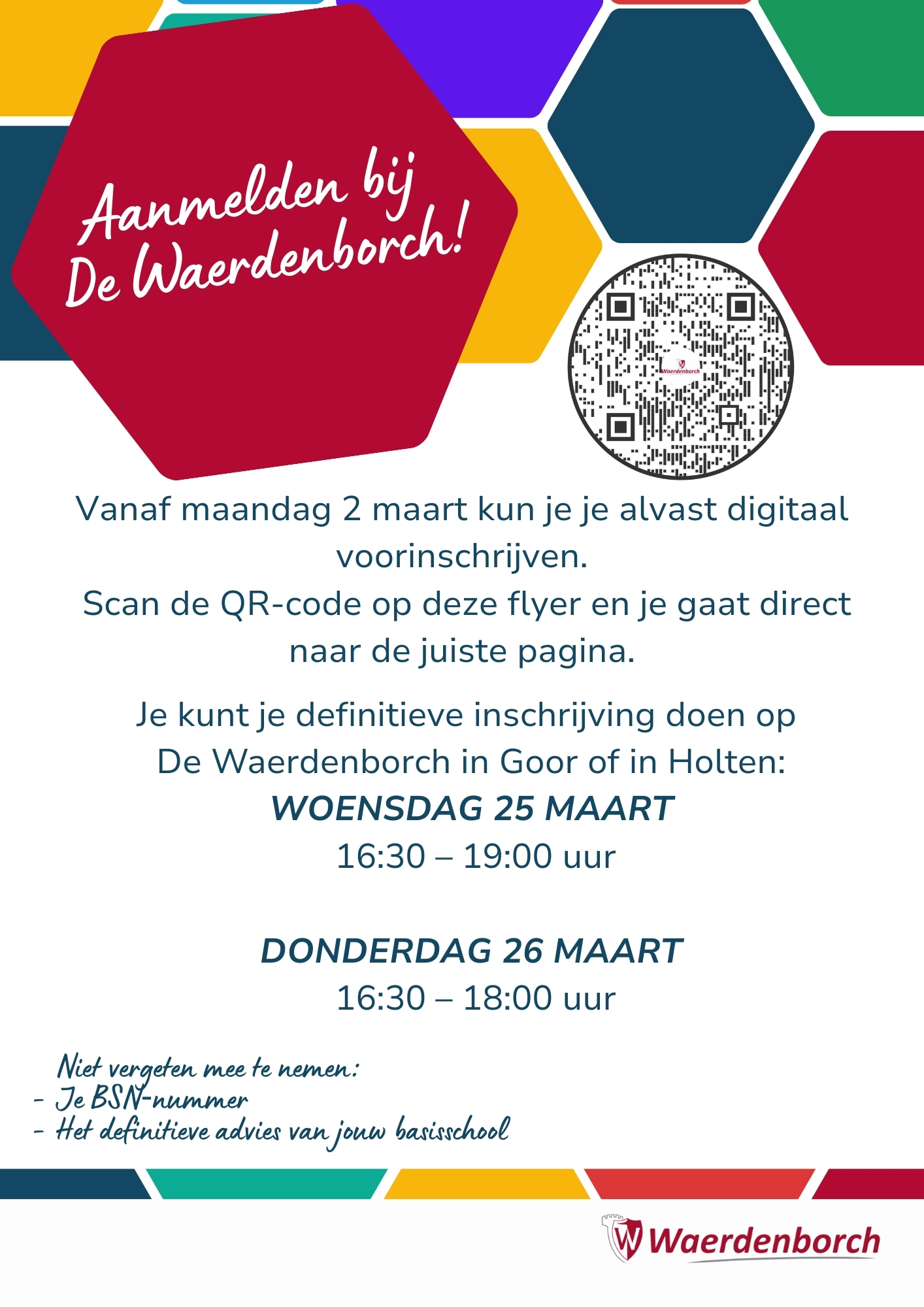 Je kunt je definitieve inschrijving doen op De Waerdenborch in Goor of in Holten: