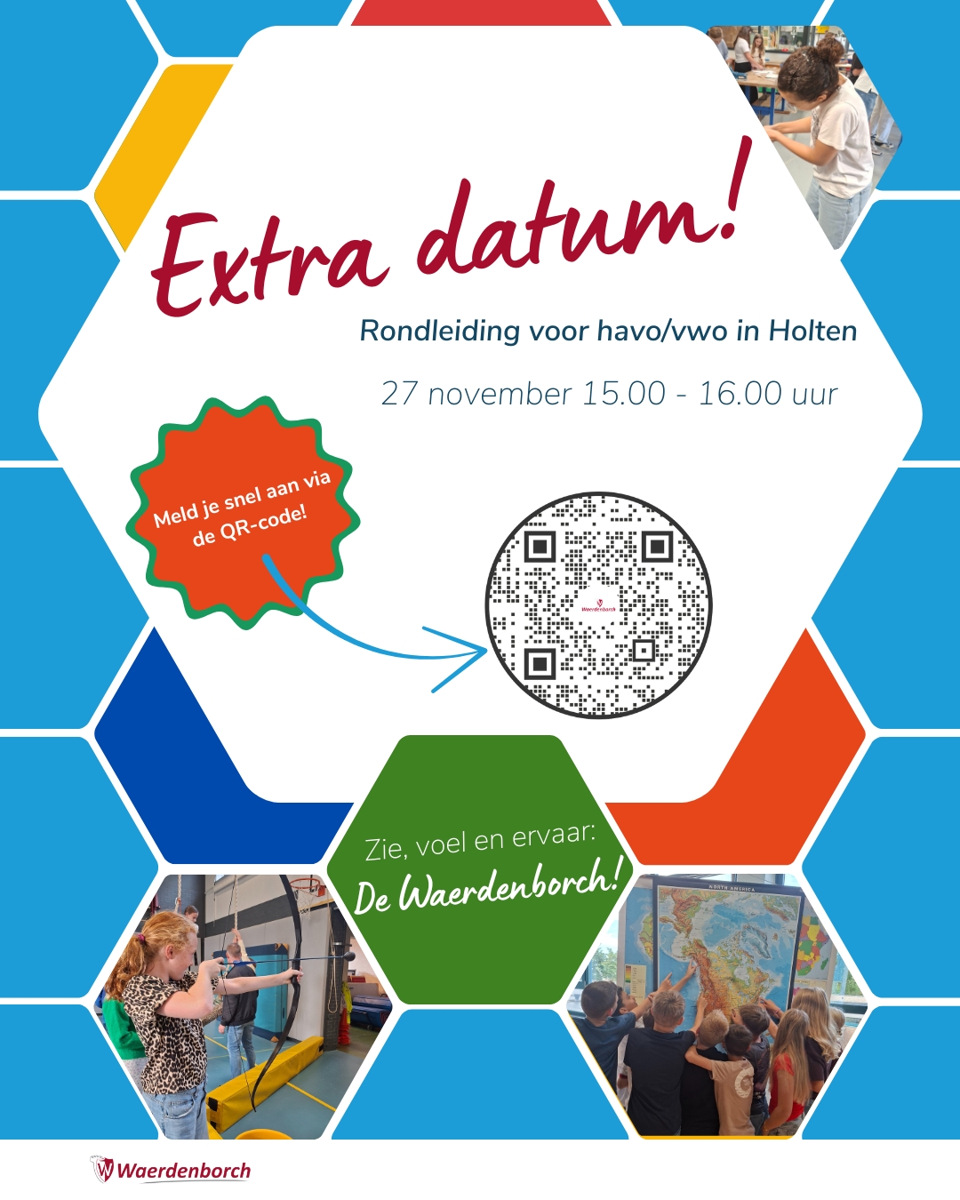 Goed nieuws! Vanwege de grote belangstelling hebben we een extra rondleiding toegevoegd op donderdag 27 november van 15:00 tot 16:00 uur in Holten, speciaal voor leerlingen die interesse hebben in de havo of vwo.