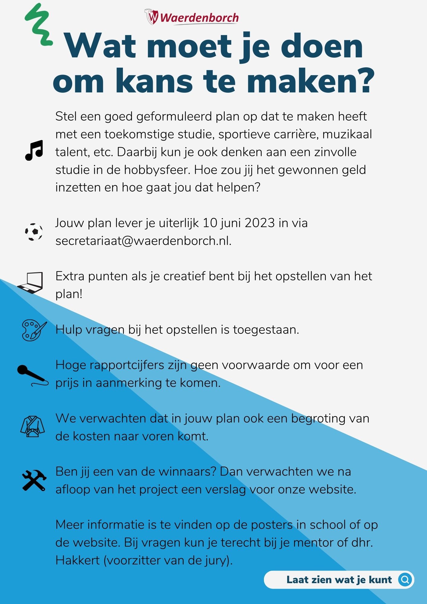 Beschrijf in een plan hoe jij het geld gaat inzetten en geef daarbij aan hoe dit jou precies zou helpen om jouw talent te ontwikkelen op korte en lange termijn. Misschien wil je een project opzetten, een studie of trainingskamp volgen of duur materiaal aanschaffen. De jury beoordeelt de inzendingen en onder de winnaars wordt €2.500,- verdeeld. Wil je eerst meer informatie? Dan kun je terecht bij dhr. Hakkert, voorzitter van de jury.